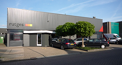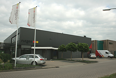 Exterieur bedrijfspand Rutges Montfoort, inclusief belettering en logo op de gevel. Klik hier voor een afbeelding van de oude situatie