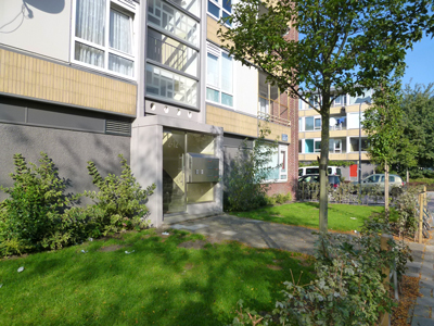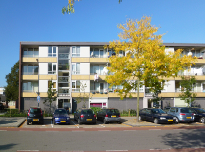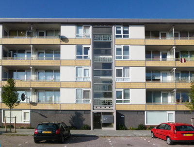 Het project betreft renovatie van 5 flats die onderdeel zijn van een groter ensemble met vergelijkbare laagbouwwoningen uit de zestiger-jaren. Uitgangspunt was de materiaalkleuren te laten spreken: okergele steen en de terracotta steen. Entrees vervangen door nieuw glaspui met rvs postkasten en bellenpanelen. Verbijzondering in het trappenhuisglas van de hoogbouw waarvoor het patroon is gebruikt van de originele erfafscheidingen van de laagbouw. Het bevordert op een subtiele manier de samenhang tussen hoogbouw en laagbouw.Eigenlijk bedoeld als 'glas in lood' patroon wat te duur bleek, geeft het patroon met folies een bewegend beeld door het zonlicht in de trappenhuizen.