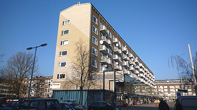 Kleur balkons en alle beton voor flat van architect Dudok uit 1956 in Tuinstad Geuzenveld Amsterdam voor Stadgenoot.